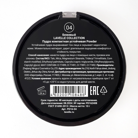 LavelleCollection Пудра PD-16 тон 04 бежевый,компактная устойчивая SPF-15 Powder