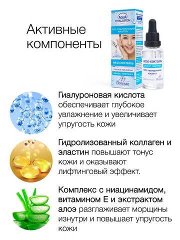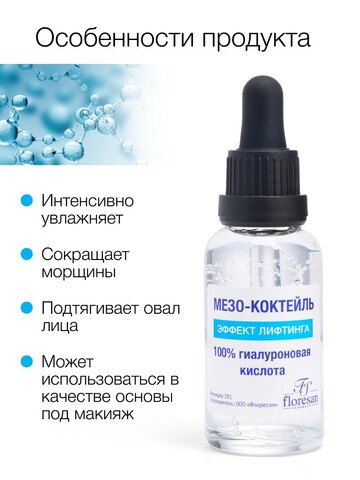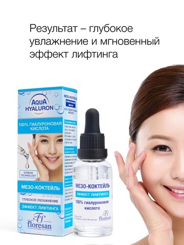 Концентрированный мезо-коктейль разработан для эффективного ухода за кожей лица и шеи. 100% гиалуроновая кислота оказывает выраженное увлажняющее действие; комплекс гидролизованного коллагена и эластина стимулирует обновление клеток, восстанавливает контур лица, улучшает тургор кожи и разглаживает сетку мелких морщинок. Результат, как после салонного ухода глубокое увлажнение и мгновенный эффект лифтинга!
