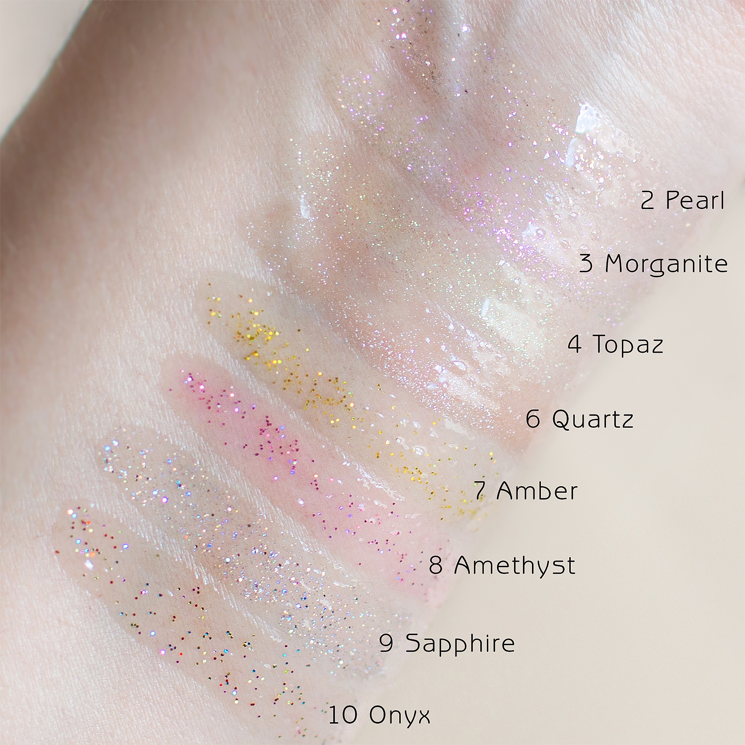 Палитра представлена в трех сияющих текстурах: глитерные – для создания смелых и насыщенных образов, глянцевые – для свежих и объемных губ и прозрачный - «жидкое стекло» – на любой случай жизни.