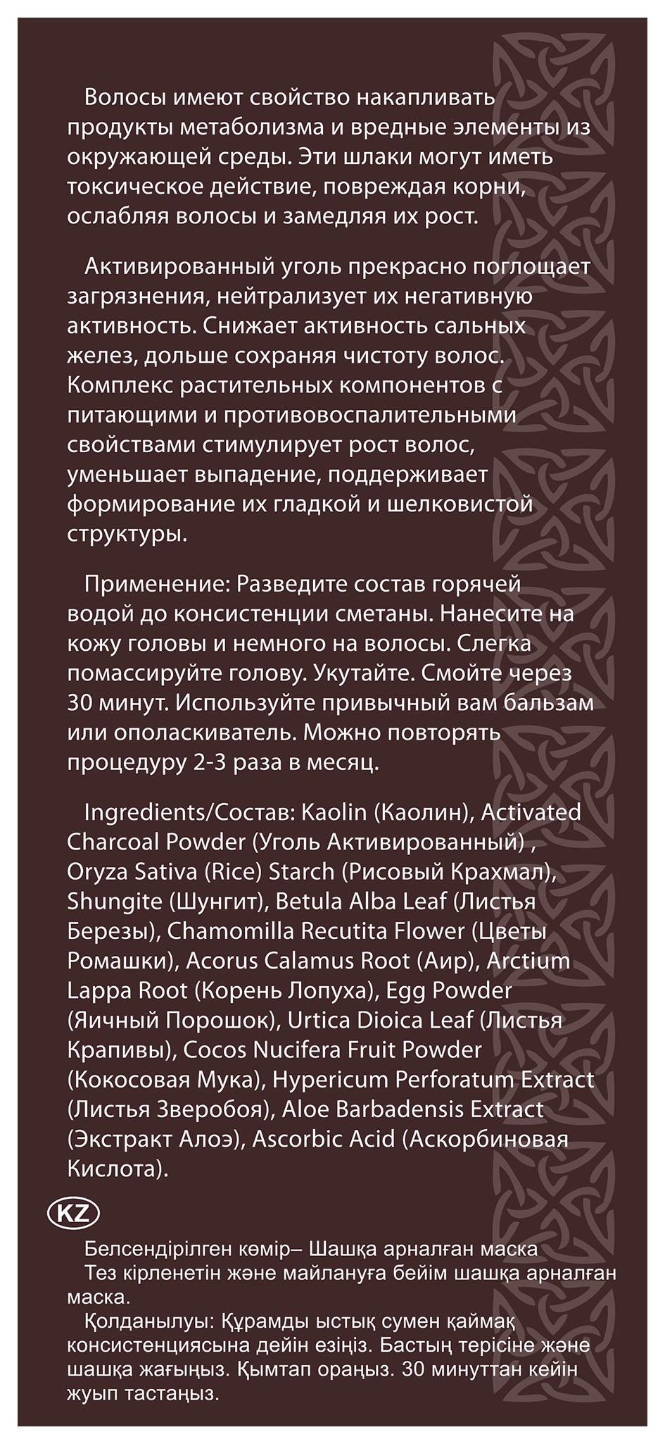 Активированный уголь прекрасно поглощает загрязнения, нейтрализует их негативную активность. Снижает активность сальных желез, дольше сохраняя чистоту волос. Комплекс растительных компонентов с питающими и противовоспалительными свойствами стимулирует рост волос, уменьшает выпадение, поддерживает формирование их гладкой и шелковистой структуры.