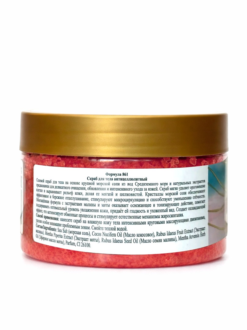 Солевой скраб для тела на основе крупной морской соли из вод Средиземного моря и натуральных экстрактов предназначен для деликатного очищения, обновления и интенсивного ухода за кожей. Скраб мягко удаляет ороговевшие клетки и выравнивает рельеф кожи, делая ее мягкой и шелковистой. Кристаллы морской соли обеспечивают эффективное и бережное отшелушивание, стимулируют микроциркуляцию и способствуют уменьшению отёчности. Обогащённая формула с экстрактами малины и мяты оказывает освежающее и тонизирующее действие, помогает поддерживать оптимальный уровень увлажнения кожи, придаёт ей гладкость и ухоженный вид. Cоздает охлаждающий эффект, что активизирует обменные процессы и стимулирует естественные механизмы жиросжигания.