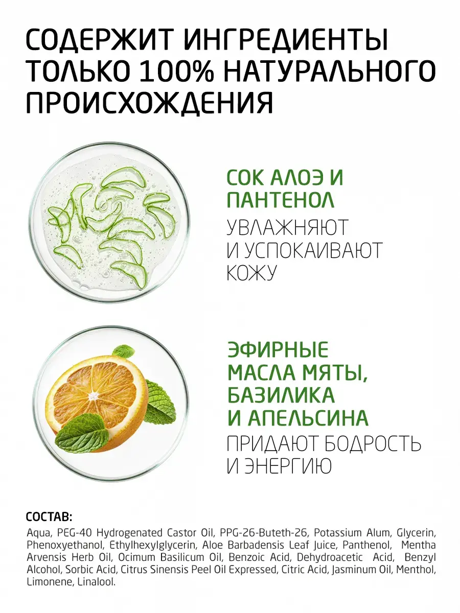Экстракт алоэ вера и пантенол ухаживают за кожей, помогая снять раздражение и сохраняя ее увлажненной. Эфирные масла апельсина, мяты и базилика наполняют энергией и оставляют легкий ненавязчивый аромат, поднимая настроение. Средство не содержит отдушек, красителей или искусственных ароматизаторов, поэтому подходит даже для чувствительной кожи.
