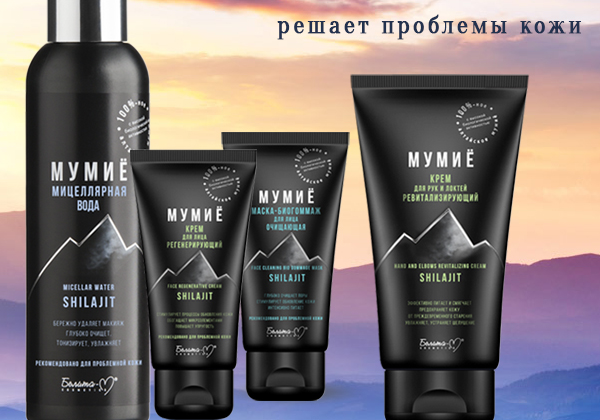 Мумиё, бесценный «дар гор»… Столетиями его использовала народная медицина как средство восстановления здоровья и красоты. Наша новая разработка – средства серии косметики «Мумиё» - решают проблемы потери волос, а также обеспечивают эффективный уход за проблемной кожей лица и тела.