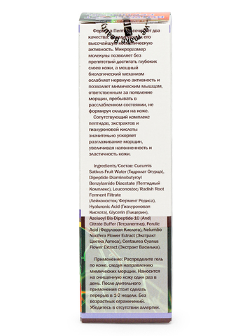 Формула Пептида сочетает два качества, формирующих его высочайшую косметическую активность. Наноразмер молекулы позволяет без препятствий достигать глубоких слоев кожи, а мощный биологический механизм ослабляет нервную активность и позволяет мимическим мышцам, ответственным за появление морщин, пребывать в расслабленном состоянии, не формируя складки на коже.