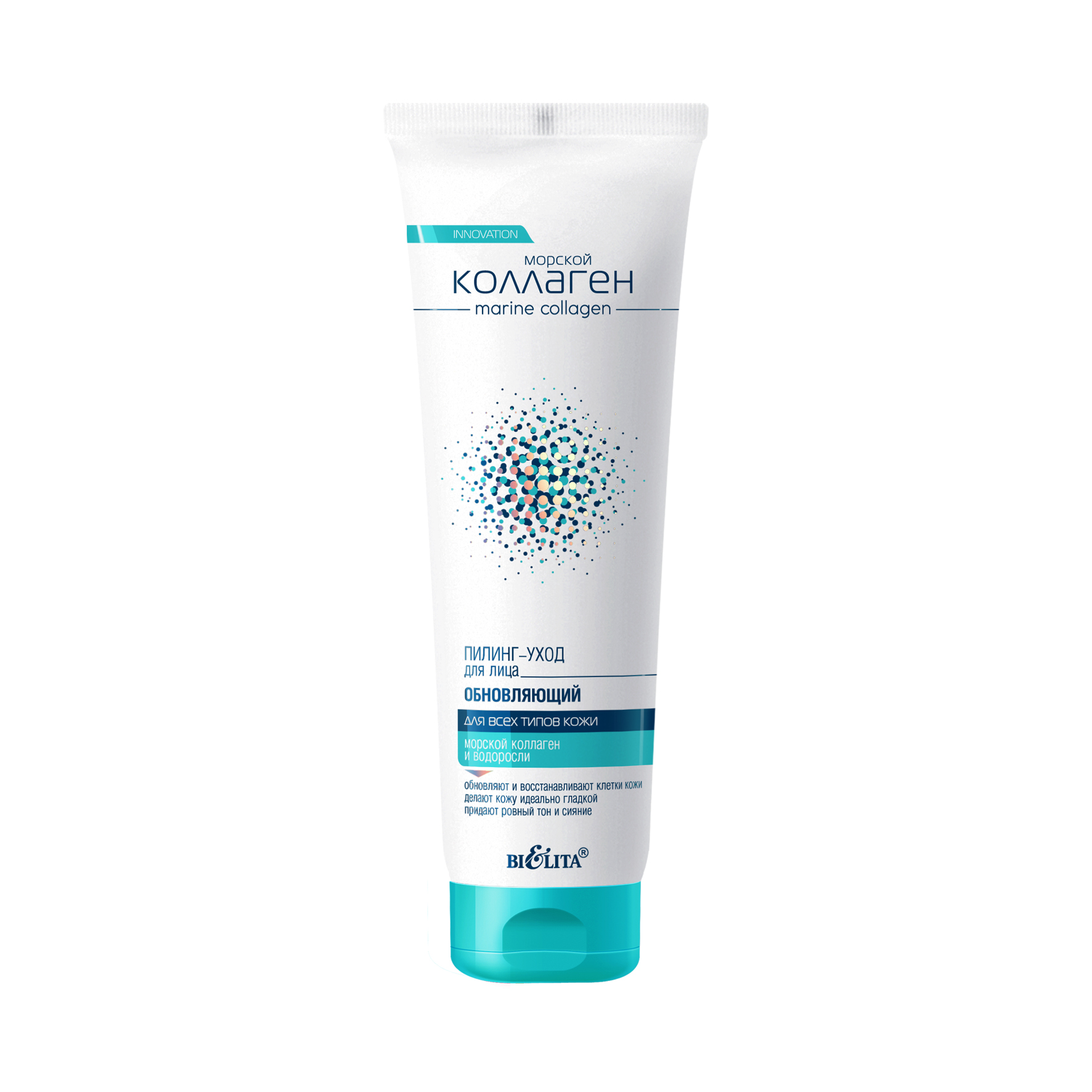 Активные компоненты: морской коллаген, бурые водоросли, микрочастицы оксида кремния, целлюлоза, аллантоин и бетаин.