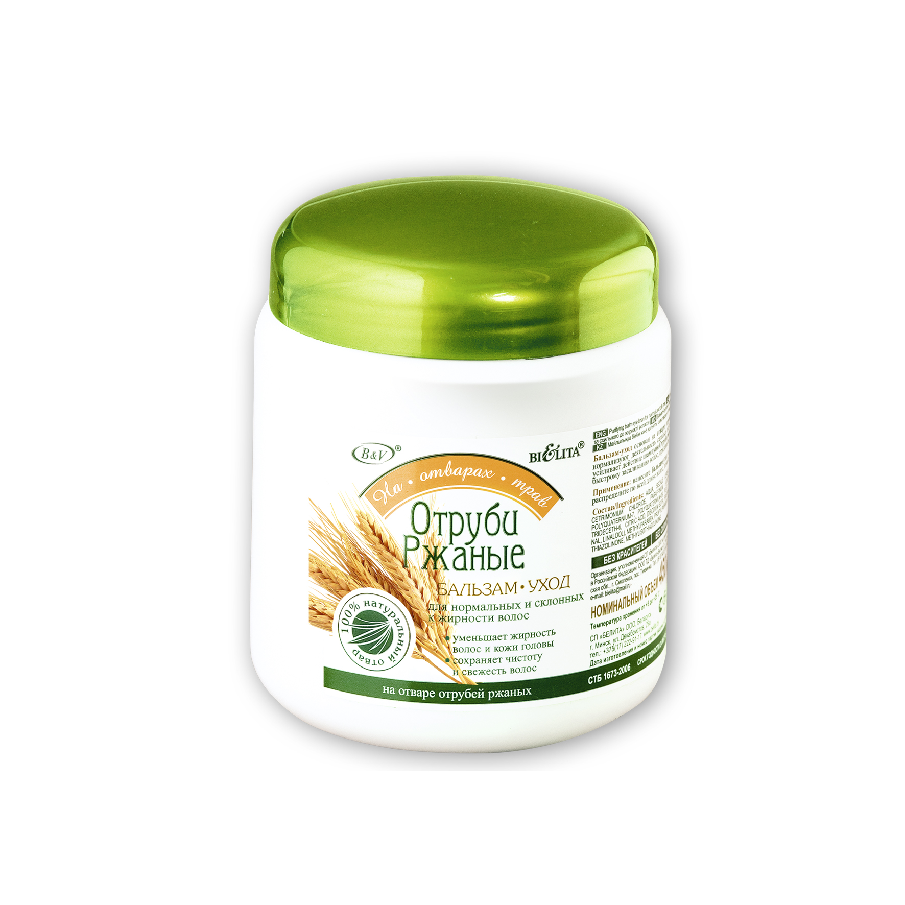 Бальзам-уход основан на отваре отрубей ржаных, которые активно нормализуют деятельность сальных желез кожи головы. Закрепляет и усиливает действие шампуня Отруби ржаные для нормальных и склонных к жирности волос: препятствует быстрому засаливанию волос, придавая им ухоженный вид.