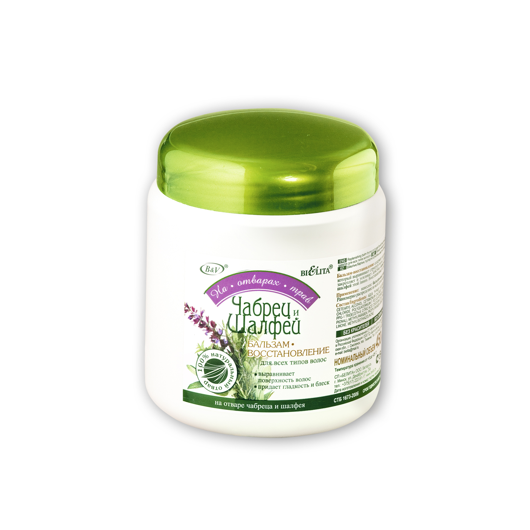Бальзам-восстановление содержит полезный комплекс отвара чабреца и шалфея, который выравнивает структуру волос, облегчает расчесывание. Бальзам закрепляет и усиливает действие шампуня-восстановления Чабрец и шалфей для всех типов волос: восстанавливает естественный блеск волос.