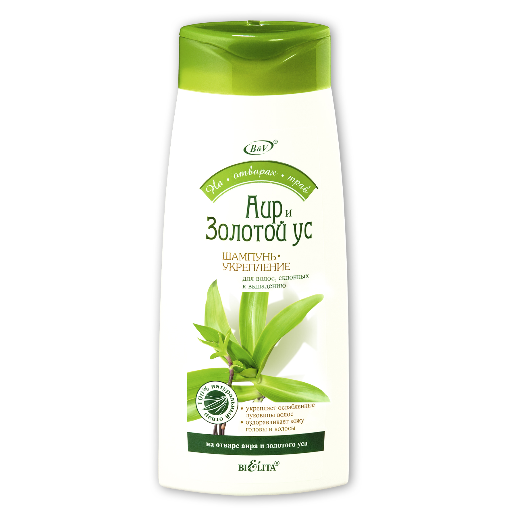 Шампунь-укрепление содержит полезный отвар аира и золотого уса. Активно укрепляет корни волос и способствует их росту. Придает волосам силу и природный блеск.