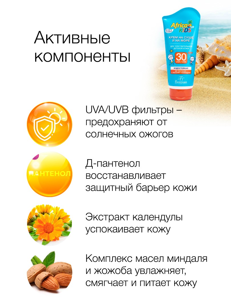 Нежный крем серии Africa kids создан специально для сверхчувствительной к солнцу детской кожи при нахождении, как на суше, так и в воде. Комплекс УФ-А и УФ-B фильтров, Д-пантенол и календула максимально эффективно защищают кожу от вредного воздействия ультрафиолетовых лучей и предохраняют кожу от появления солнечных ожогов. Водостойкая формула обеспечивает защиту кожи на длительный срок во время пребывания на солнце и после водных процедур. Устойчив к песку и поту.