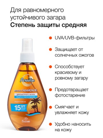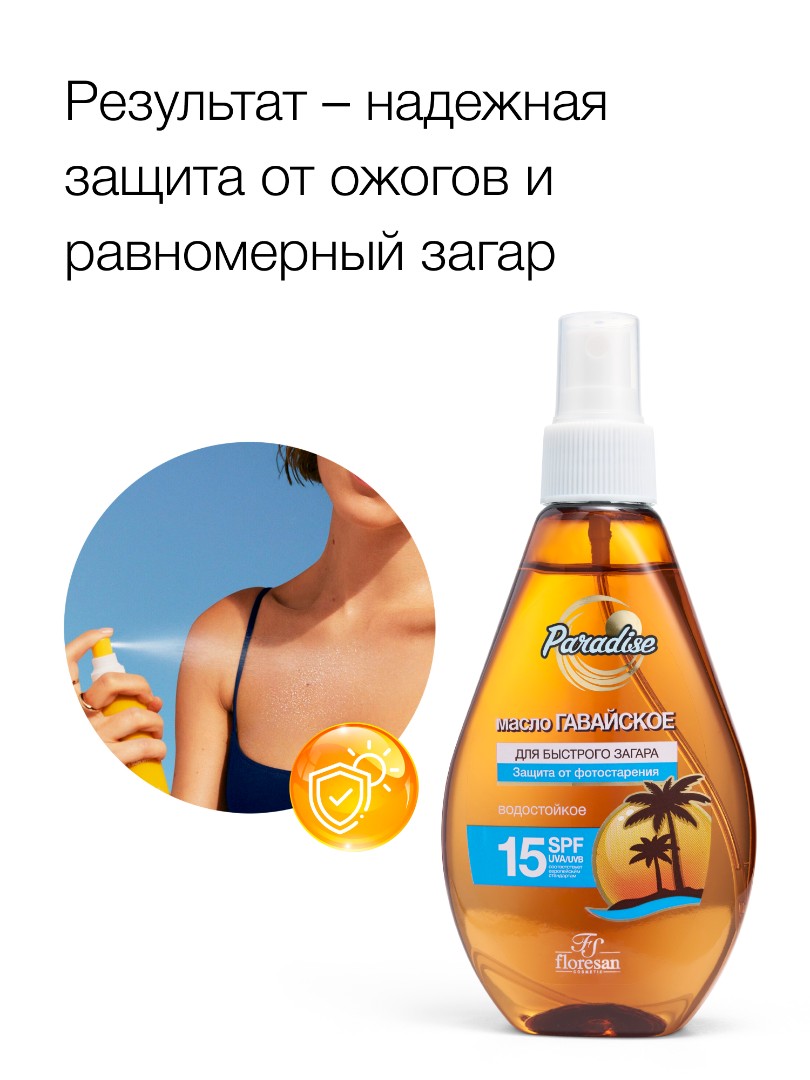 Floresan Солнцезащитная серия PARADISE Масло для быстрого загара "Гавайское" SPF 15, 160мл