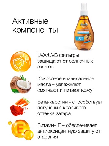 Водостойкое масло обеспечивает быстрый, равномерный и безопасный загар. Комплекс UVA/UVB-фильтров надежно защищает кожу от воздействия ультрафиолетовых лучей. Масло Ши увлажняет и питает кожу, обеспечивая комплексную защиту и предупреждая ее преждевременное старение. Масло легко наносится и быстро впитывается. Предназначено для всех типов кожи.