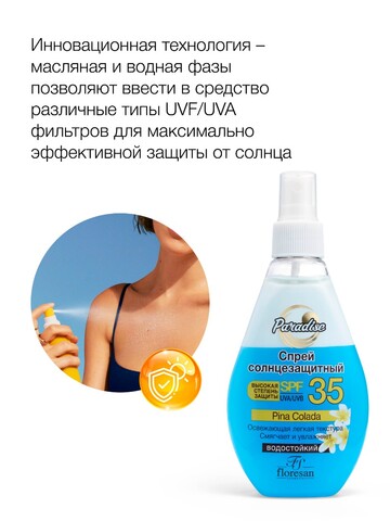 Спрей для безопасного загара с нежной двухфазной текстурой это новейшая разработка для защиты от негативных последствий, вызванных ультрафиолетом. Уникальность формулы заключается в возможности ввода различного типа UVA/UVВ фильтров в разные текстуры средства масляную и водную. При смешивании фаз усиливаются защитные свойства средства, предотвращая появление ожогов и предупреждая преждевременное старение кожи. Гиалуроновая кислота увлажняет кожу, предохраняя от пересушивания. Комплекс витаминов и экстрактов смягчают, питают и освежают кожу.Спрей легко наносится и быстро впитывается, не оставляя разводов на коже.