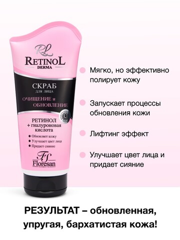 Скраб для лица с ретинолом и натуральными скрабирующими частицами для лица мягко, но эффективно полирует кожу, отшелушивает ороговевшие клетки, одновременно очищая, питая и увлажняя кожу. Уже после первой процедуры запускаются процессы обновления и омоложения клеток, кожа подтягивается, создавая эффект лифтинга. Ретинол в сочетании с ниацинамидом и комплексом натуральных экстрактов и масел повышает упругость кожи, усиливает клеточный обмен веществ, способствует разглаживанию морщин, улучшает цвет лица и придает сияние.