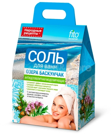 Устраняет эффект апельсиновой корки Ускоряет обменные процессы Способствует сжиганию лишнего жира Укрепляет и тонизирует кожу Озеро Баскунчак - самое соленое озеро в мире, в нем добывают уникальную, минеральную соль известную во всем мире, как источник красоты, здоровья и долголетия. Волшебная ванна с целебной солью – это самый приятный способ борьбы с целлюлитом и лишними килограммами. Соль озера Баскунчак, обогащенная экстрактами розмарина, душицы, шалфея, плюща и маслом кипариса моделирует Ваше тело, как опытный массажист: эффективно устраняет эффект апельсиновой корки, ускоряет обменные процессы, способствуя сжиганию жира, укрепляет и тонизирует кожу. Способ применения Растворите 250 гр. соли в ванне с теплой водой (37-38 оС). Продолжительность принятия ванны: 15-20 мин.