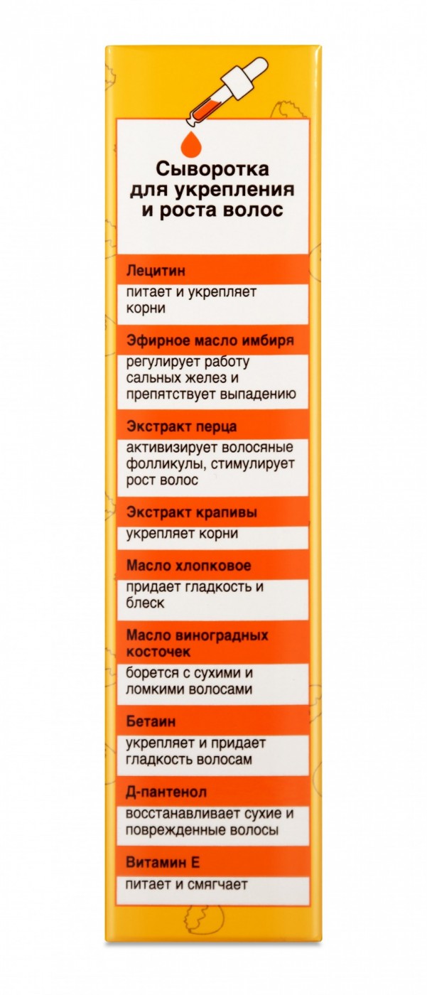 Сыворотка для укрепления, усиления роста и восстановления волос на основе лецитина и комплекса витаминов и натуральных экстрактов помогает значительно улучшить состояние ослабленных волос. Никакой другой продукт не способен так придавать волосам блеск, ухоженность и густоту, как лецитин, выделенный из натуральных яичных желтков. Лецитин активно восстанавливает поврежденные волосы, питает и укрепляет ослабленные корни. Сбалансированная формула сыворотки ускоряет поступление питательных веществ к луковицам, предупреждает выпадение волос и помогает их усиленному росту. Дарит объем, плотность и упругость истонченным волосам, склонным к выпадению и ломкости.
