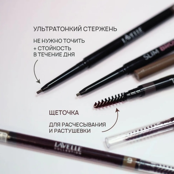 Тонкий стержень позволяет красиво и детально прорисовать волоски, придавая бровям визуальный естественный обьём.